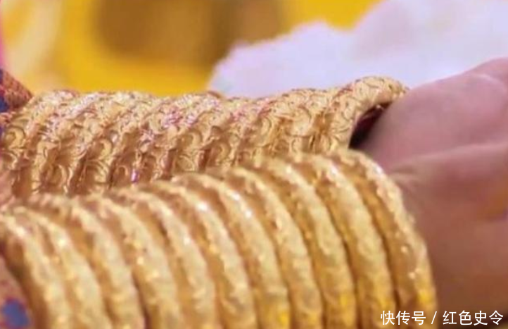 法都拉公主为这套新娘服点缀了不少的金饰品,傍边手各11个大金镯,两手盘算22个大金镯子戴在手上,金色的钻饰戴在脖颈上,红色和金色两种神采相互交汇,十分唯好意思。