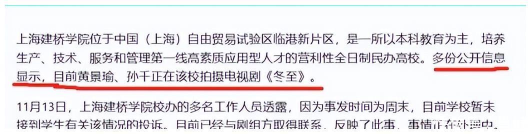 据知情东说念主露馅,这个剧组是电视剧《冬至》的剧组,公开的信息不错查到,咫尺黄景瑜和孙千是该电视剧的主演。 笔者不雅点: 拍戏归拍戏,可是影响到学生的学习生存这就有点过分了。